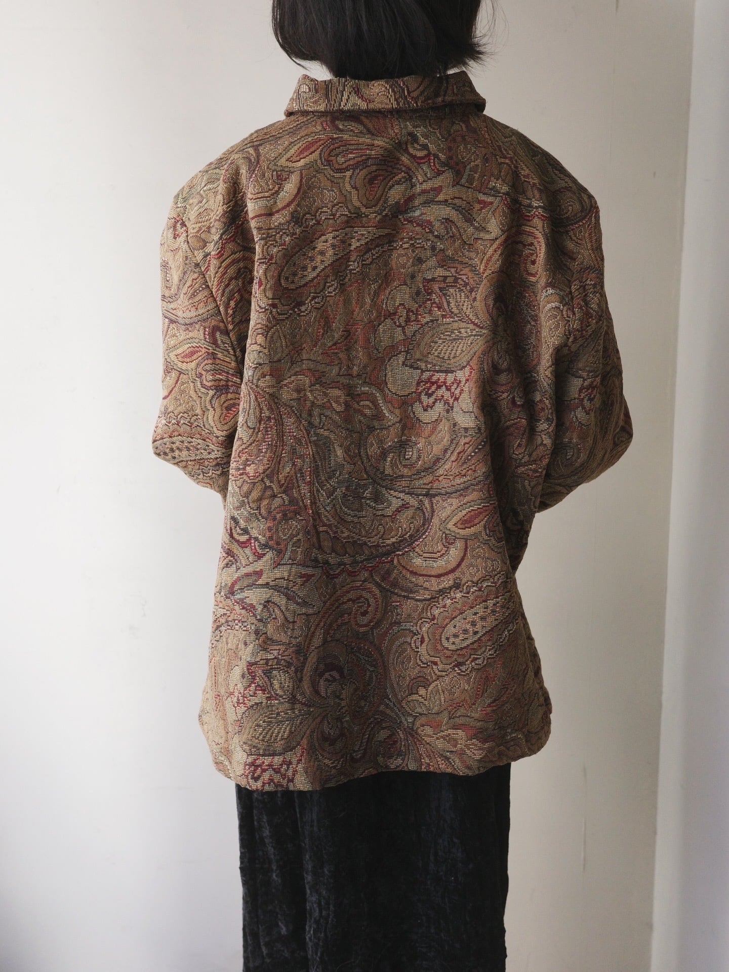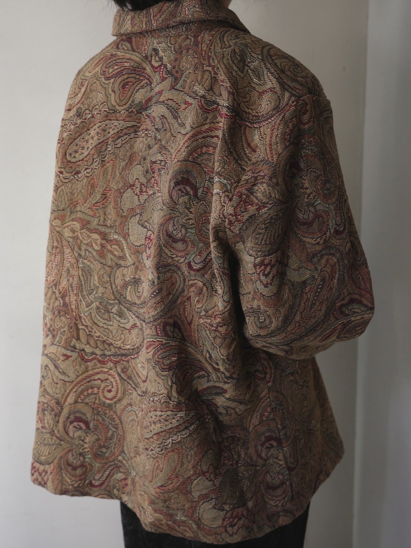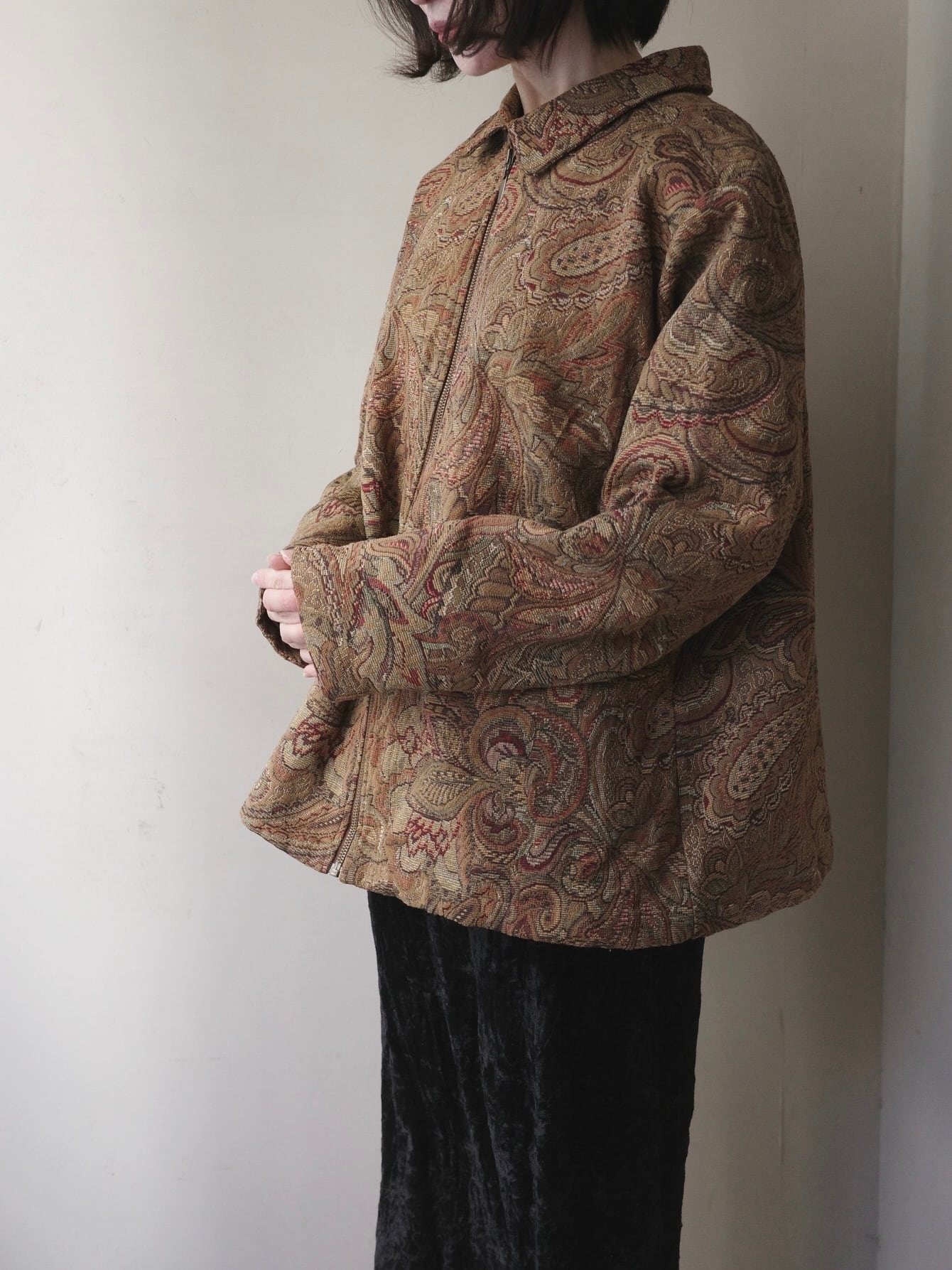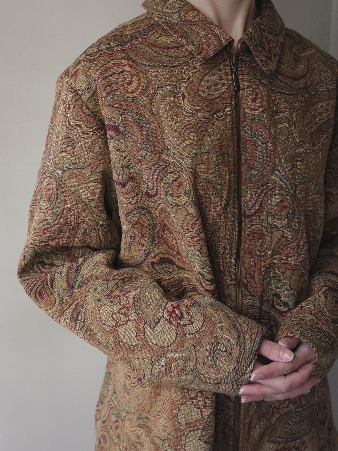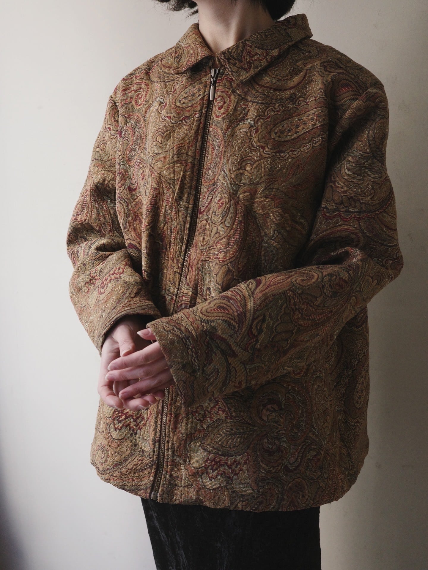 複雑に絡み合うペイズリーの曲線美が、タペストリーのような高級感を醸し出すジップアップジャケット。